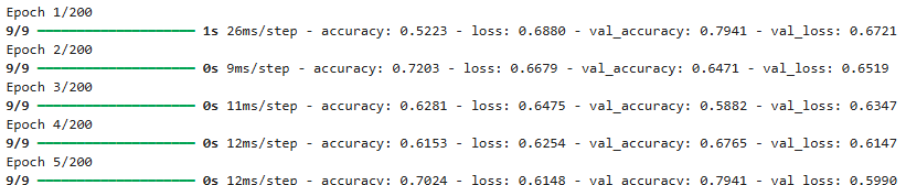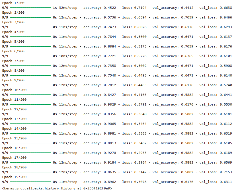 model2.fit(scaled_sub, y_sub, epochs = 200, batch_size = 16, validation_data = (scaled_val, y_val),