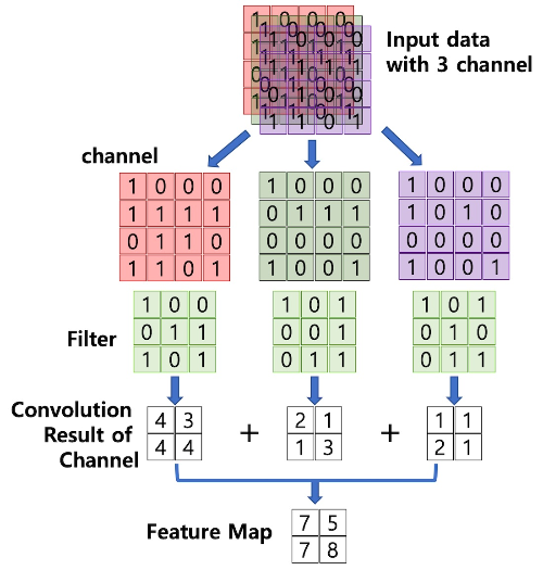- 깊이가 있는 입력에서 합성곱을 수행하기 위해서는 커널도 깊이가 있어야 함(3차원으로 구성되어야 함)