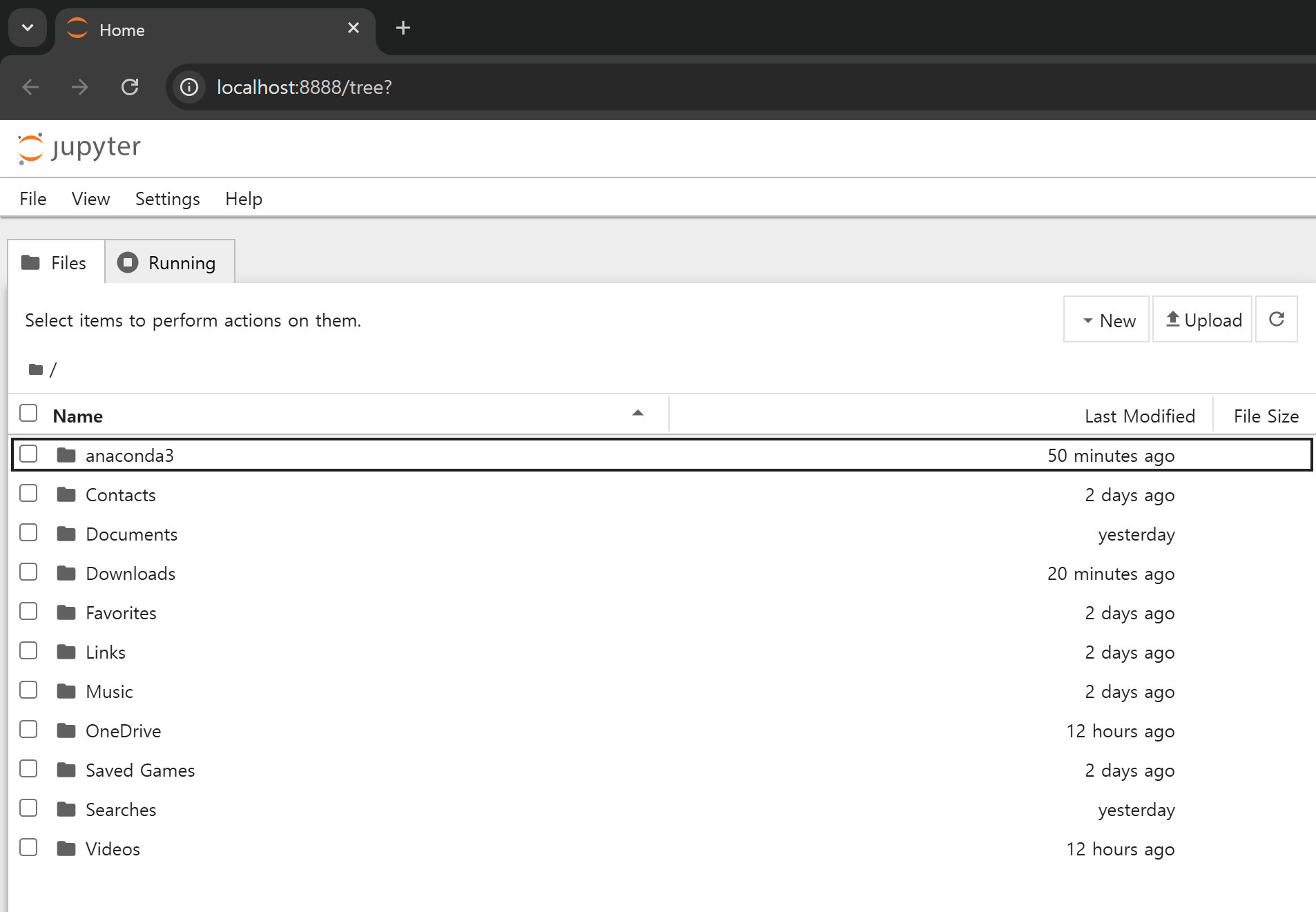 Jupyter Notebook을 실행하면 Commend Line과 비슷한 화면, Jupyter home두가지 화면이 표시됨.