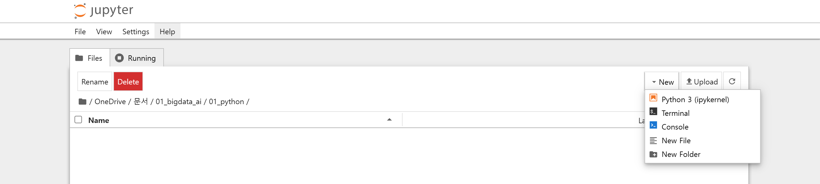 Jupyter home화면에서 작업한 python파일을 저장할 경로로 이동 후 「New > Python 3 (ipykernel)」을 클릭.