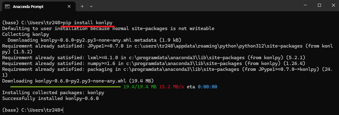 06. anaconda prompt에서 이하를 입력하여 KoNLPy를 설치