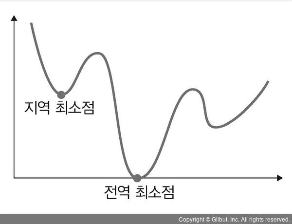 - 전역 최소점(global minimum)은 오차가 가장 작을 때의 값을 의미하므로 우리가 최종적으로 찾고자 하는 것. 최적점