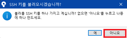 08. SSH키를 불러오시겠습니까? 라는 메세지가 나오면 「아니오」를 클릭