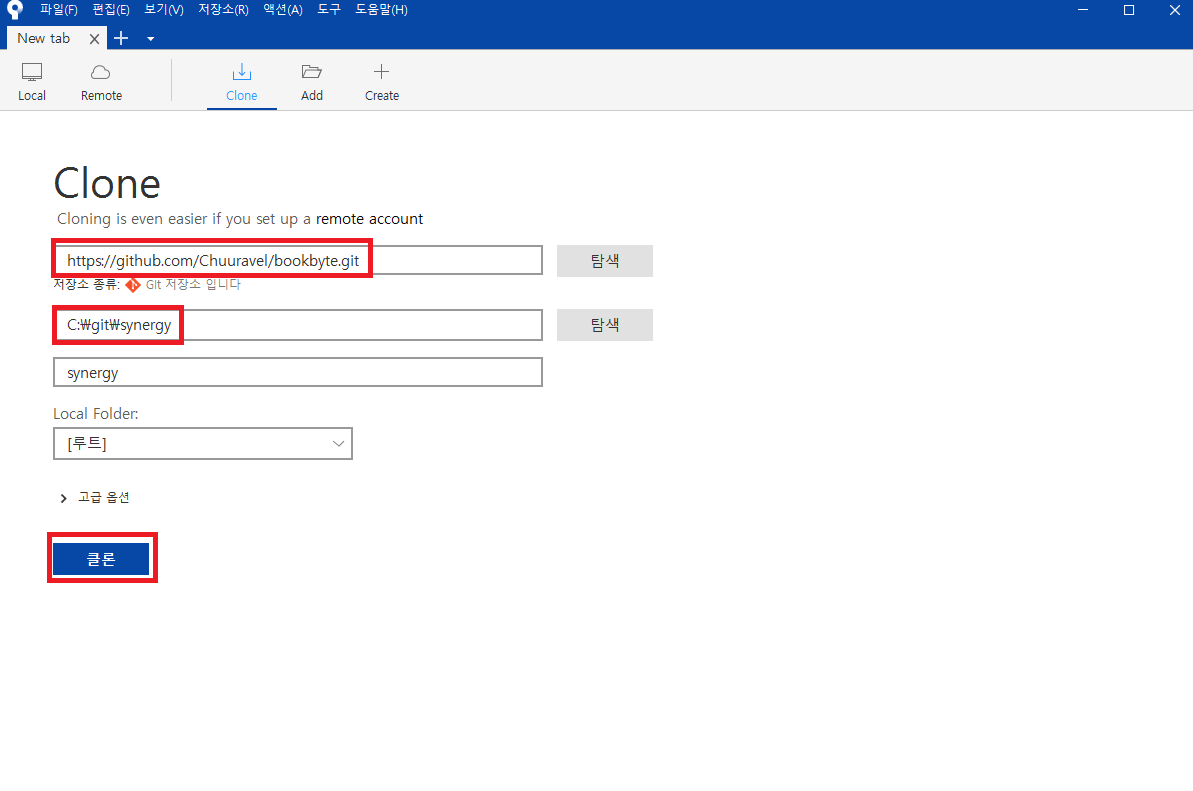 13. 리모트 저장소, 로컬 저장소 path를 입력 후 「클론」을 클릭