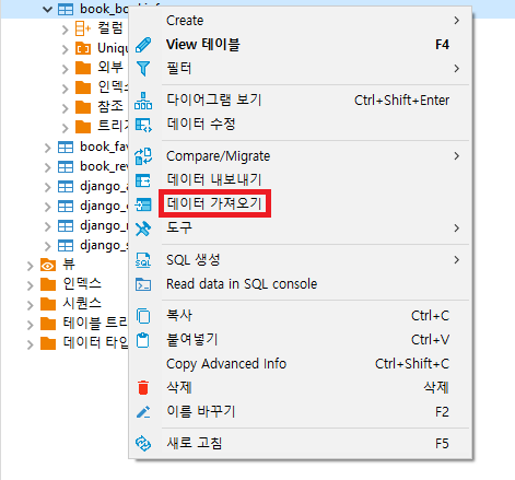 02. 데이터를 입력하고자 하는 테이블을 마우스 우클릭 후 「데이터 가져오기」 클릭