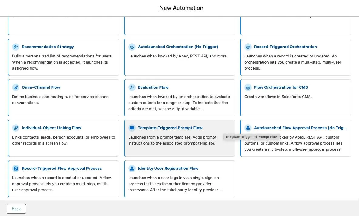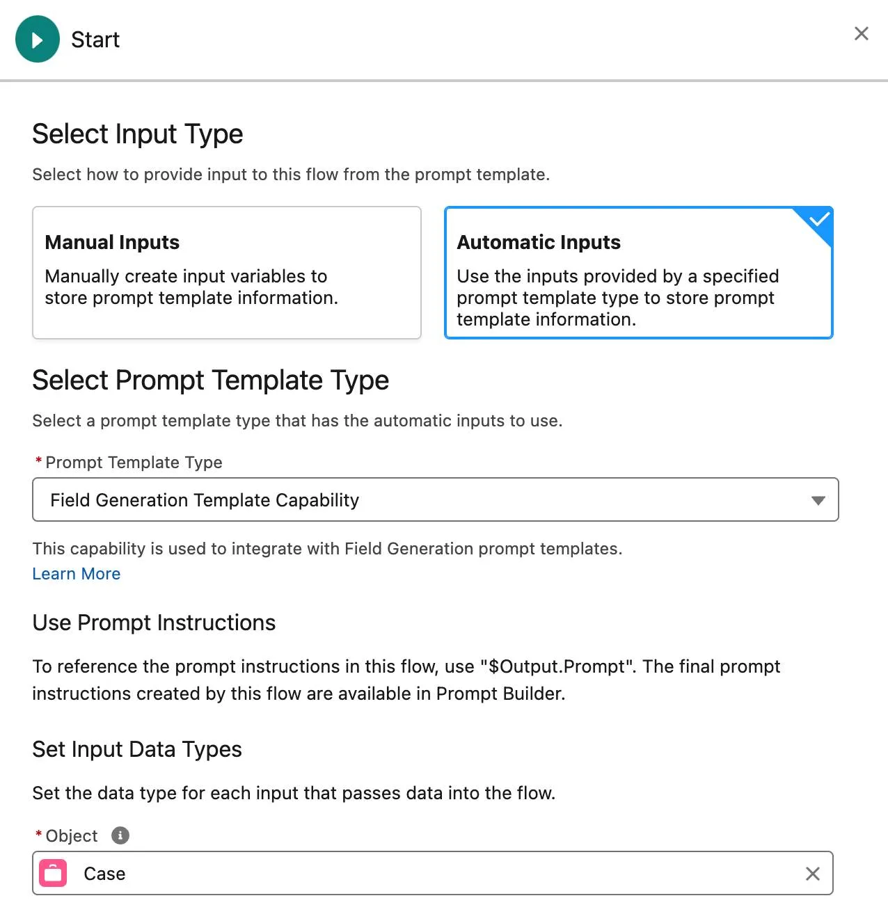 Flow Builder가 로드된 후 Linda는 Search Automations(검색 자동화) 상자에 template(템플릿)을 입력하고 Template-triggered Prompt Flow(템플릿 트리거 프롬프트 플로)를 선택합니다. 그런 다음 Linda는 Start(시작) 패널에 다음 정보를 입력합니다.