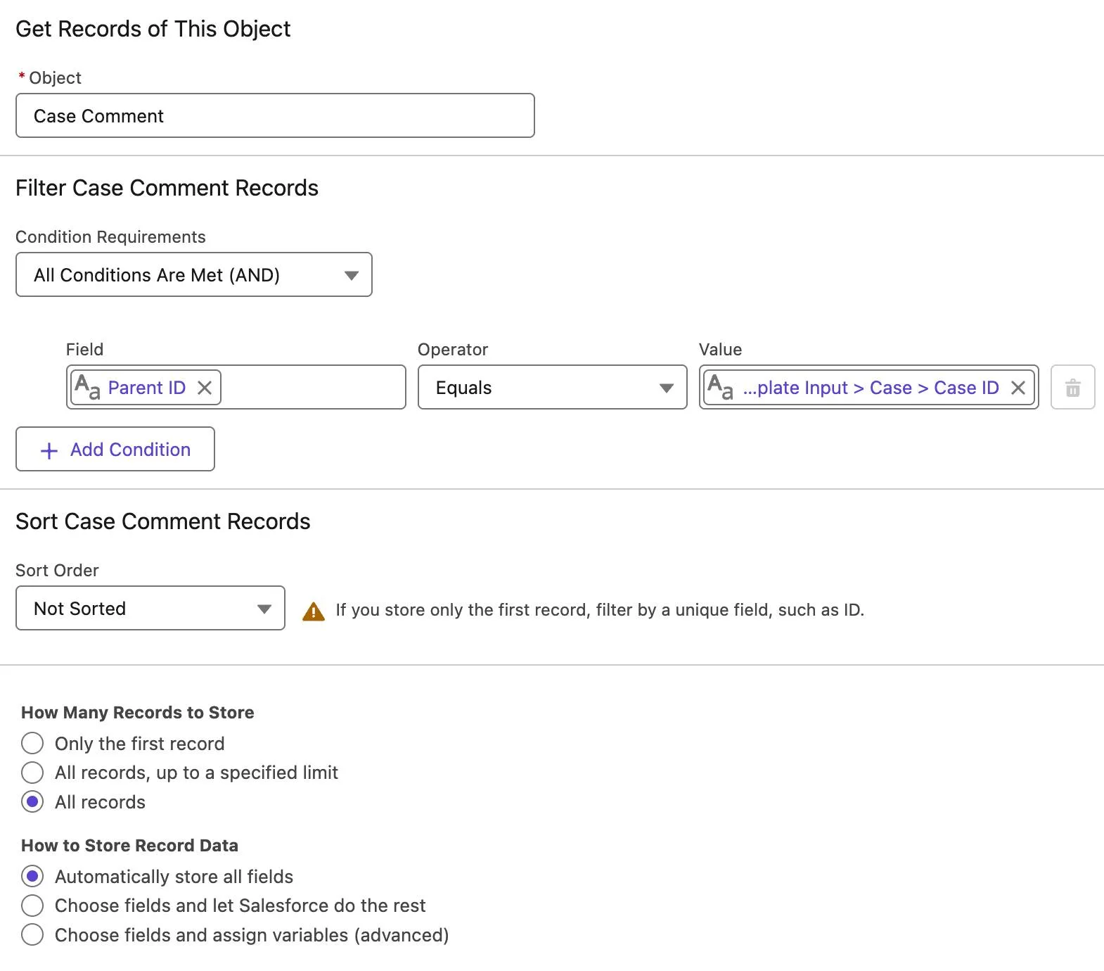 Linda는 프롬프트에 케이스의 모든 설명이 포함되기를 원하므로 Get Records(레코드 가져오기) 요소를 추가하여 이를 검색하고 컬렉션에 저장합니다.