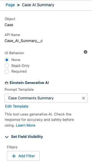 Field Properties(필드 속성) 패널의 Einstein Generative AI(Einstein 생성형 AI) 섹션에서 약식 필드에 할당할 필드 생성 프롬프트 템플릿을 선택합니다.