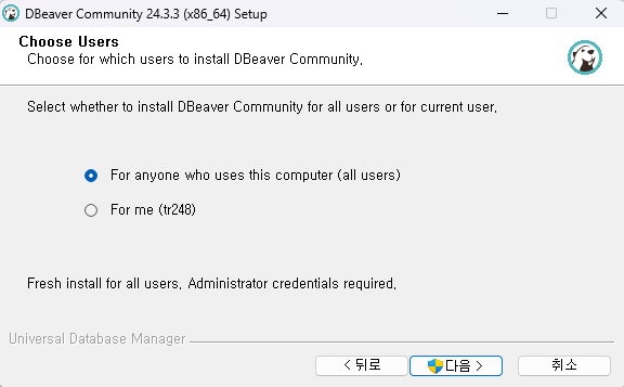 08. DBever를 이용할 유저를 선택 후 「다음」을 클릭