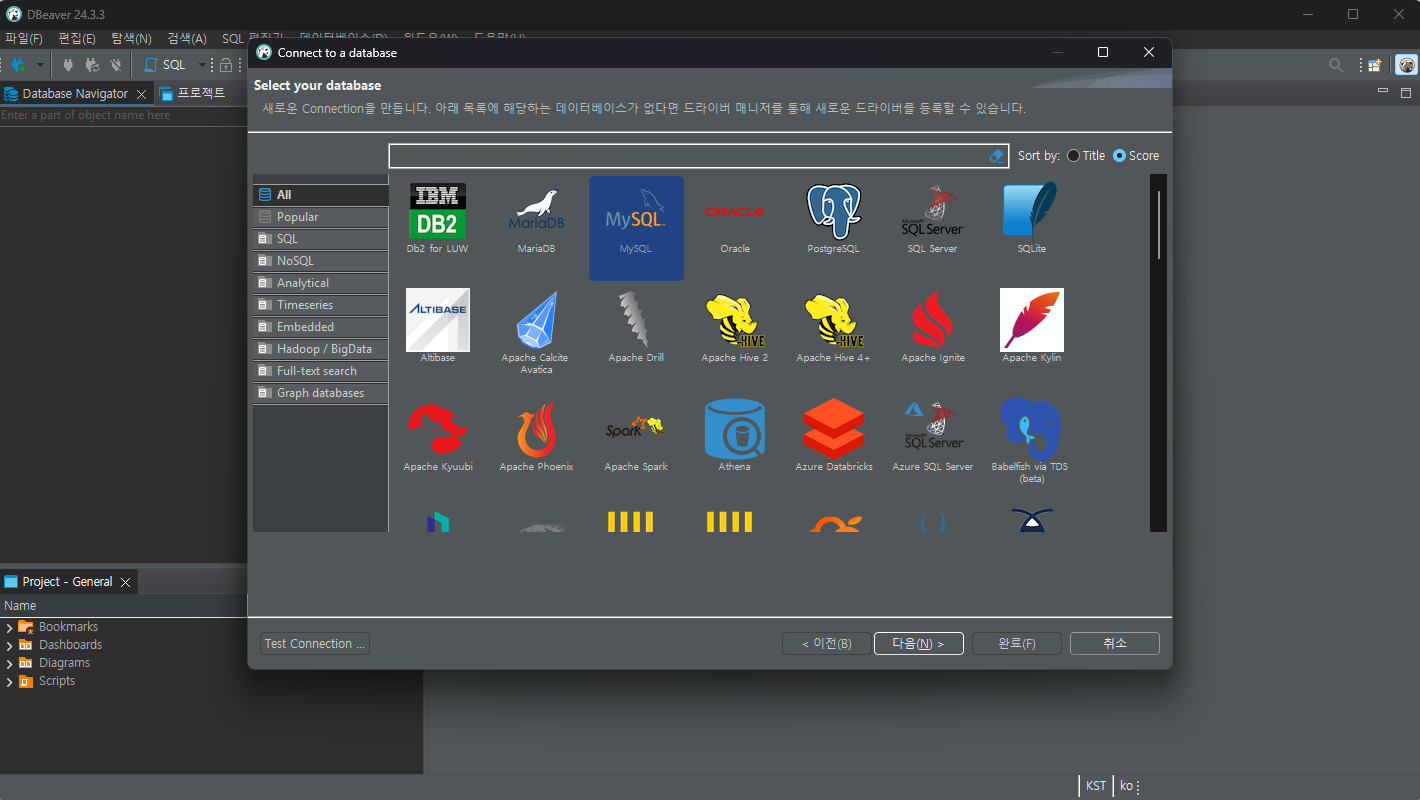 02. 필자는 Mysql에 연결예정이므로, MySQL을 선택 후 다음을 클릭