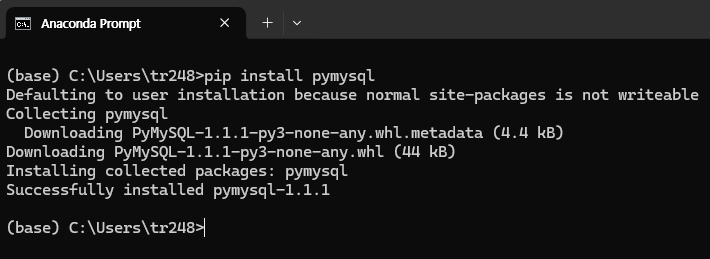 「pip install pymysql」을 입력해, pymysql을 다운로드