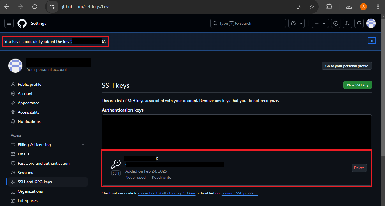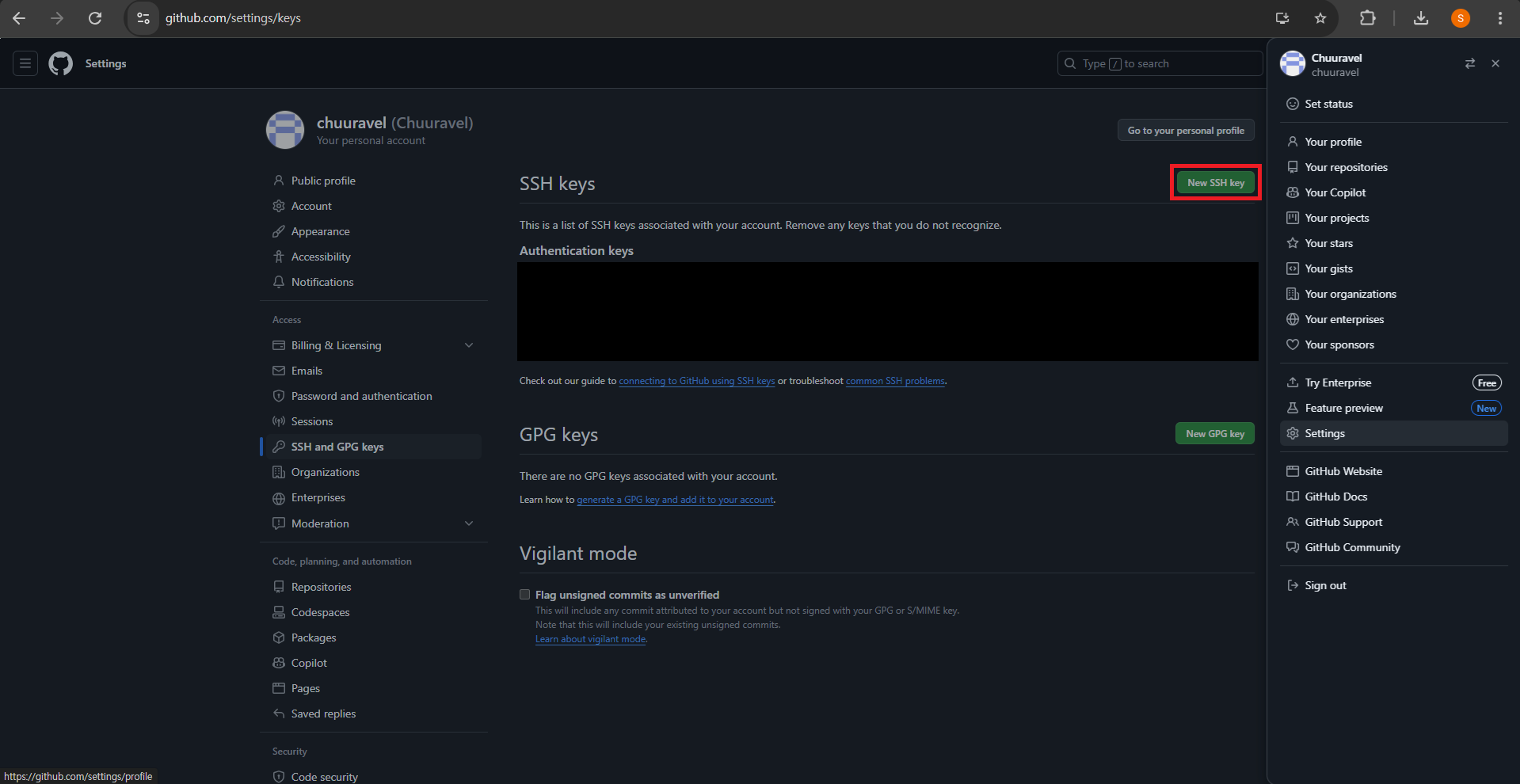 ● GitHub → Settings → SSH and GPG keys → New SSH key 클릭