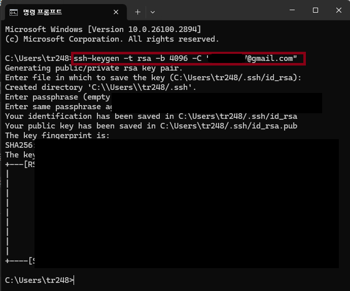 로컬에서 SSH Key를 생성을 위해 명령 프롬프트(cmd)에서 이하 명령어를 입력