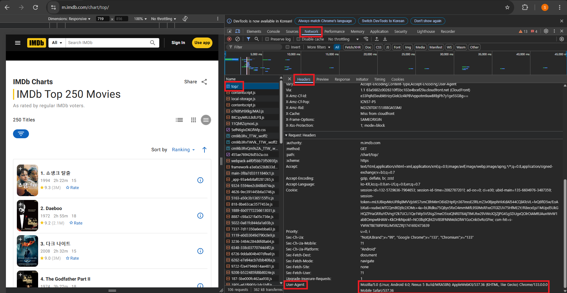 imdb에서 클라이언트 변경 후 크롤링 https://www.imdb.com/chart/top/ IMDb Top 250 MoviesAs rated by regular IMDb voters.www.imdb.com 01. Network를 클리어한 후 URI에 접속후 「Network >headers」 에서 User-Agent를 확인 import requestsfrom bs4 import BeautifulSoupurl = "https://www.imdb.com/chart/top/"headers = {"user-agent" : "Mozilla/5.0 (Windows NT 10.0; Win64; x64) AppleWebKit/537.36 (KHTML, like Gecko) Chrome/133.0.0.0 Safar..