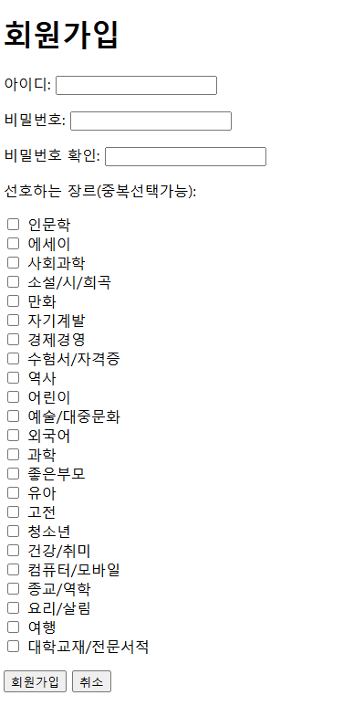 Django forms에 체크박스 넣는방법 # forms.py from django import forms...#회원가입폼class SignupForm(forms.Form): username = forms.CharField(min_length=3, label="아이디") password1 = forms.CharField(widget=forms.PasswordInput, min_length=4, label="비밀번호") password2 = forms.CharField(widget=forms.PasswordInput, min_length=4, label="비밀번호 확인") genre_choices = [ ('인문학','인문학'), ('에세이','에세이..